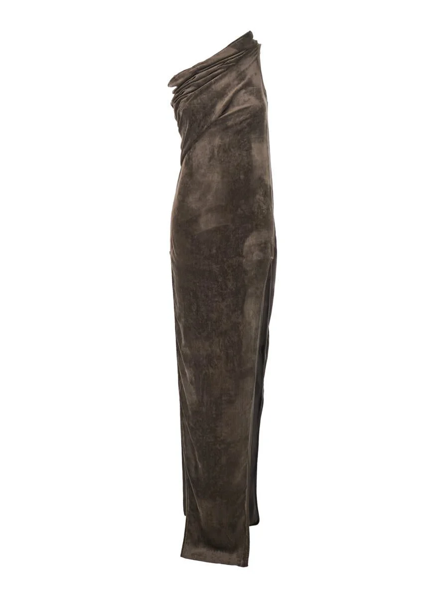 Rick Owens 'Athena Arrowhead' Brown Asymmetric Long Dress With Ruched Neckline And Side Single Slit