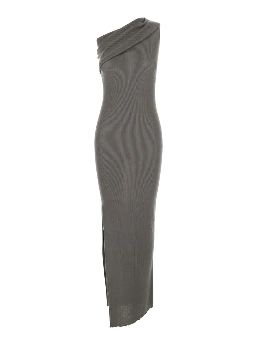 Rick Owens 'Athena' Grey Asymmetrical Long Dress With Wide Neck And Ribbed Design In Cotton Knit Wom