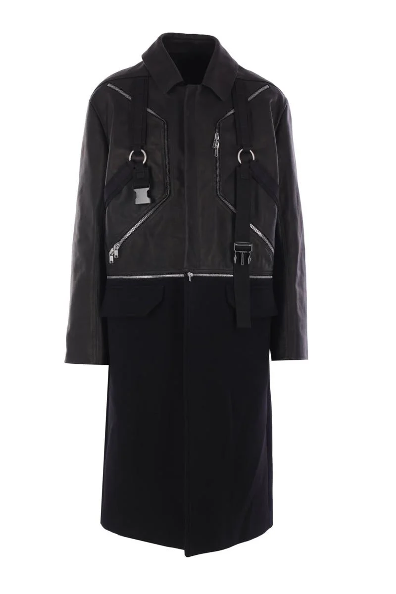 Rick Owens coat made from black leather and wool cloth. Features a pointed collar, zip closure, chest harness detail, multiple pockets, long sleeves, central vent, and lined interior. The lower wool panel can be removed via zip. Gender: Men Material: UPPER BODY AND SLEEVES 100% CALF LEATHER LOWER BODY 100% NEW WOOL BODY AND POCKETS LINING 100% COTTON Color: Black Made in: Italy Product ID: RR02E1903LOWSR109 *Import tax/duty will be calculated at checkout (If applicable)