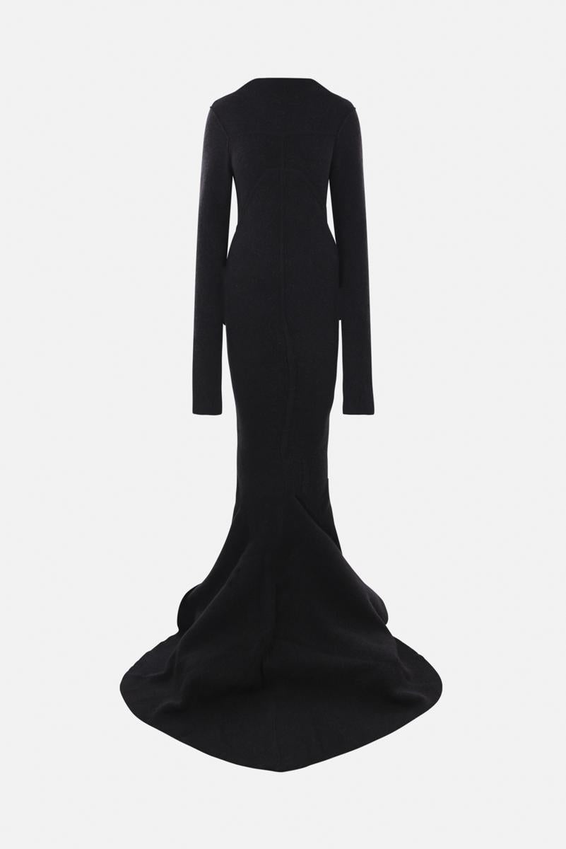 Rick Owens' long dress crafted in black alpaca wool blend knit. It features a triangular-shaped neck, long sleeeves, open back, geometric seams, train at the hem and unlined interior. Gender: Women Material: 48% ALPACA + 30% NYLON + 20% WOOL + 2% ELASTANE Color: Black Made in: IT Product ID: RO02D3688KWPL09 *Import tax/duty will be calculated at checkout (If applicable)