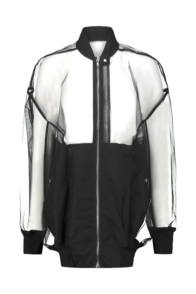 Rick Owens Jumbo Flight bomber jacket in black tulle, oversize fit, two side pockets , front zip fastening, press stud on the neck, wool collar and cuffs. Gtin code: Gender: Women Material: POLYAMIDE | 100% POLYAMIDE / 100% VIRGIN WOOL Color: Black Made in: IT Product ID: RP01E7737 TU *Import tax/duty will be calculated at checkout (If applicable)