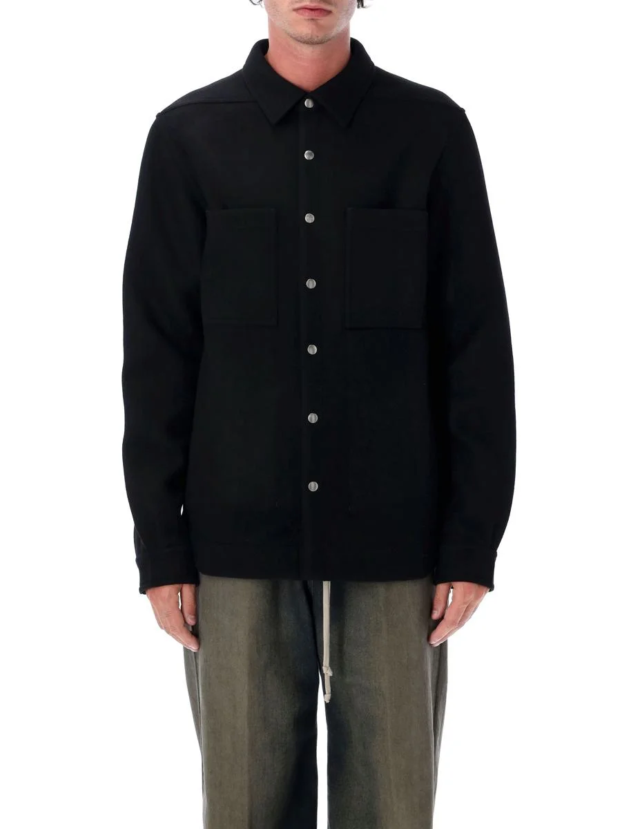 Melton outershirt by Rick Owens. Featuring: Heavyweight compact wool melton Classic collar Long sleeves with buttoned cuffs Snap button front closure Chest patch pockets Webbing strap with rivets at back Andrea is 1,90 m and wears size 50 Gender: Men Material: 100% VIRGIN WOOL Color: Black Made in: Italy Product ID: 25ARU02E1744WSF#09 *Import tax/duty will be calculated at checkout (If applicable)