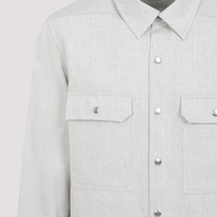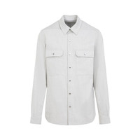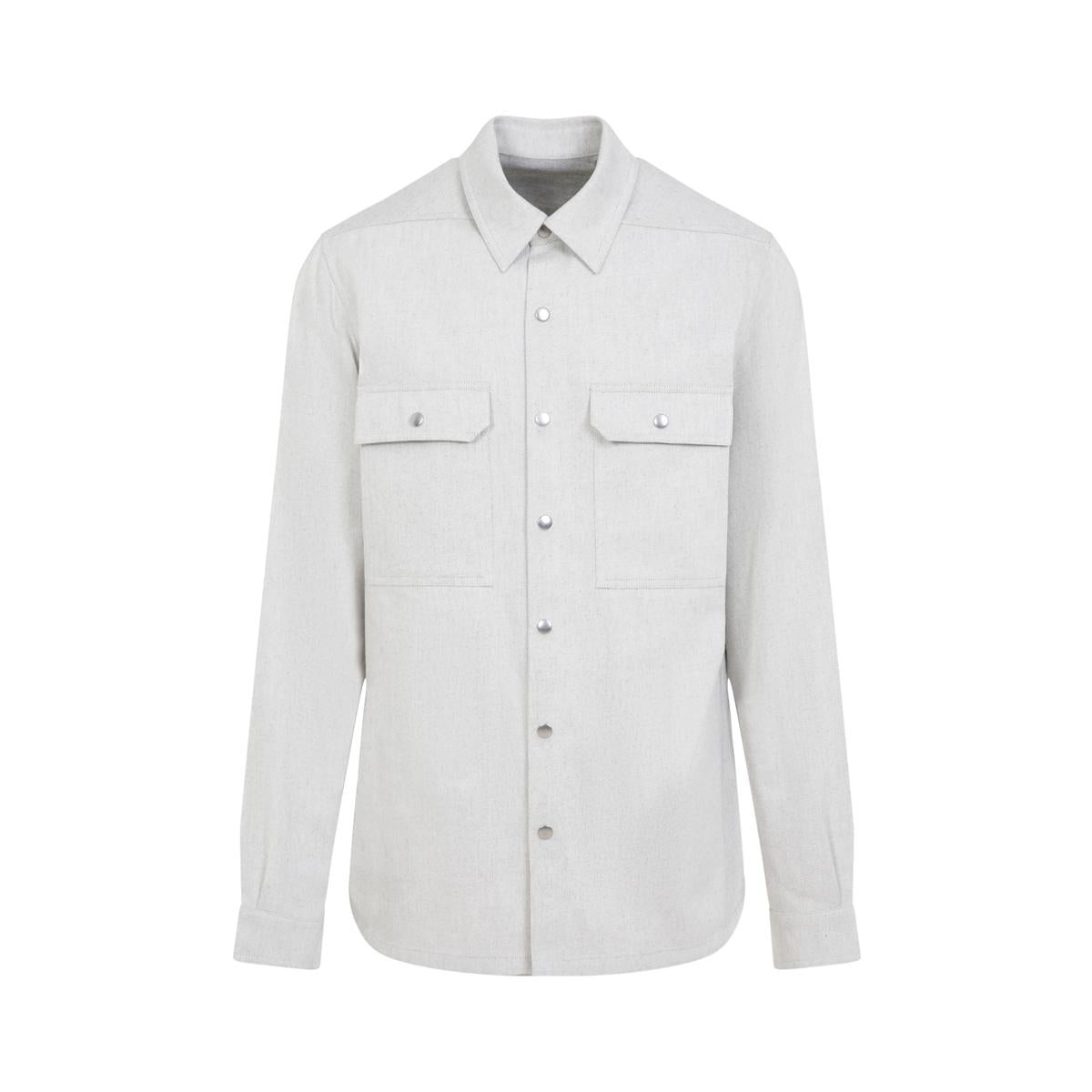 Rick Owens Grey Cotton Outershirt. Light grey cotton, classic shirt collar, front snap button fastening, two flap pockets on the breast, back yoke with signature strap detail, buttoned cuffs, round hem. Gender: Men Material: 100%COTTON Color: Beige Made in: IT Product ID: RU01E5729.DRD_41 *Import tax/duty will be calculated at checkout (If applicable)