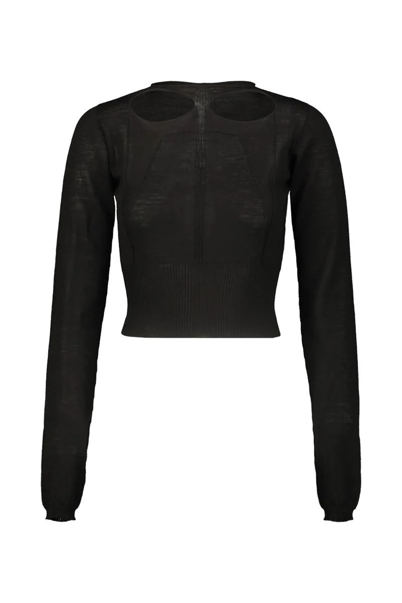 Rick Owens slashed long-sleeved cropped sweater with front opening detail, geo knit jacquard motif on the center front. Gender: Women Material: WOOL | 100% VIRGIN WOOL Color: Black Made in: Italy Product ID: RP02E4617 ML *Import tax/duty will be calculated at checkout (If applicable)