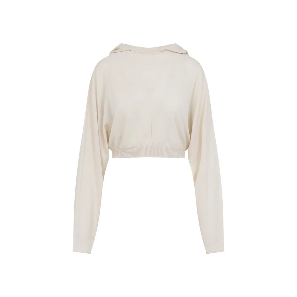 Rick Owens Natural White Virgin Wool Cropped Hooded Tunic Pullover. Pure natural white virgin wool pullover, tonal hood, dropped shoulders, long sleeves, ribbed cuffs and hem, straight hem, cropped design. Gender: Women Material: 100%VIRGIN WOOL Color: WHITE Made in: Italy Product ID: RP02E4632.M_21 *Import tax/duty will be calculated at checkout (If applicable)