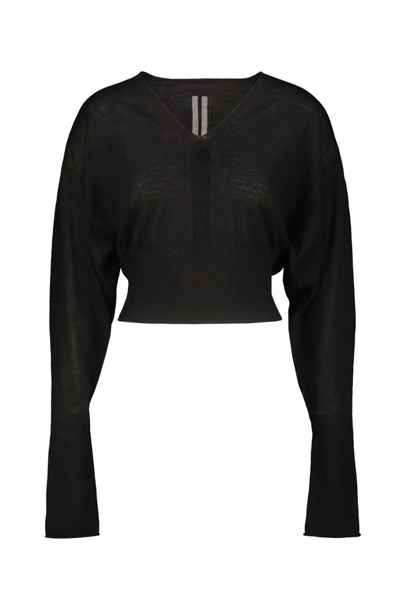 Rick Owens long-sleeved v-neck cropped sweater. GTIN code: RP02E4665 M Gender: Women Material: WOOL | 100% VIRGIN WOOL Color: Black Made in: Italy Product ID: RP02E4665 M *Import tax/duty will be calculated at checkout (If applicable)