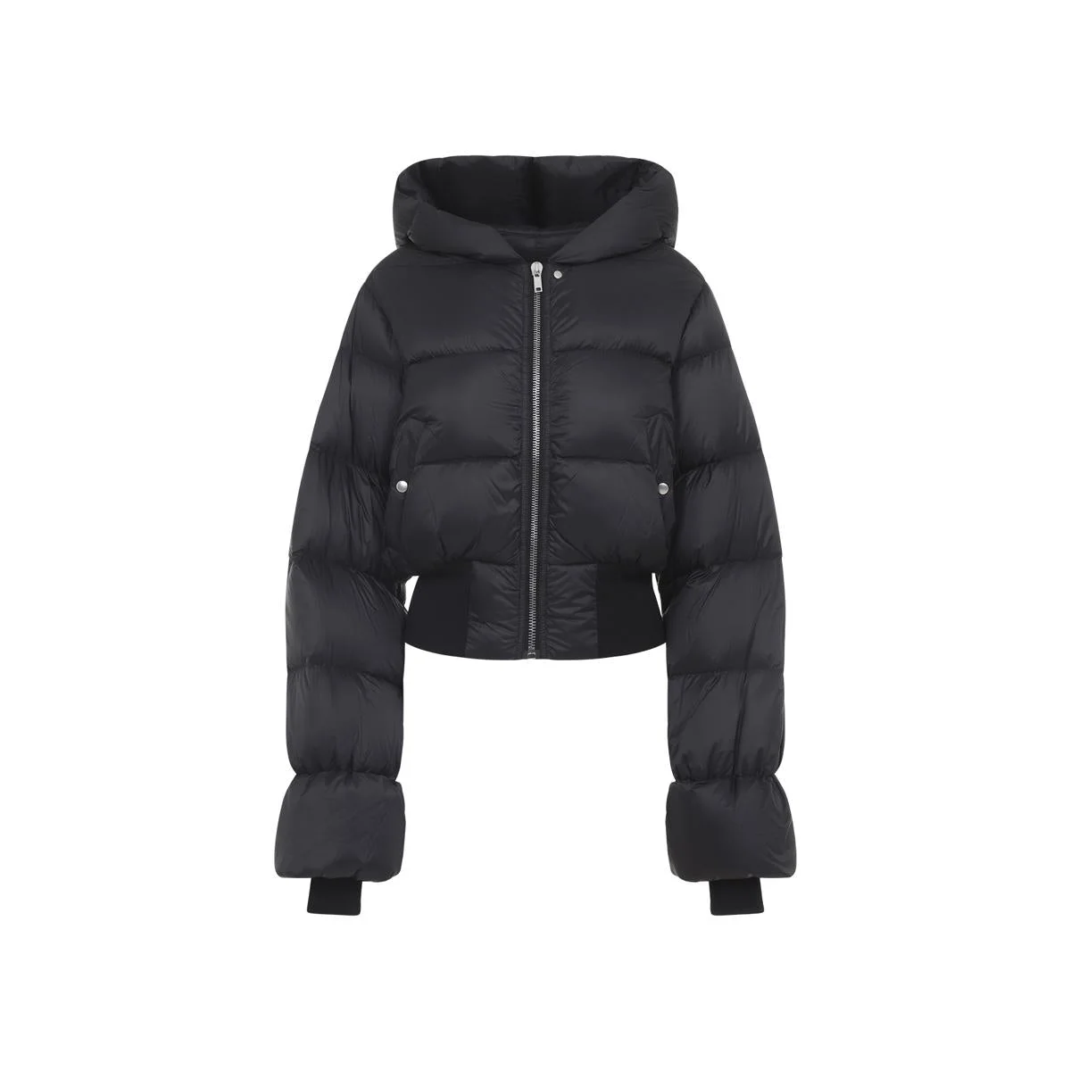 Rick Owens Black Hooded Jacket. Crafted in polyamide fabric, tonal padded hood, front zipped fastening, side buttoned pockets, extra-long sleeves, ribbed cuffs and hem cropped design, straight hem, padded design. Gender: Women Material: 100%POLYAMIDE 90%DOWN 10%FEATHER Color: Black Made in: Italy Product ID: RP02E4775.NPD3_09 *Import tax/duty will be calculated at checkout (If applicable)