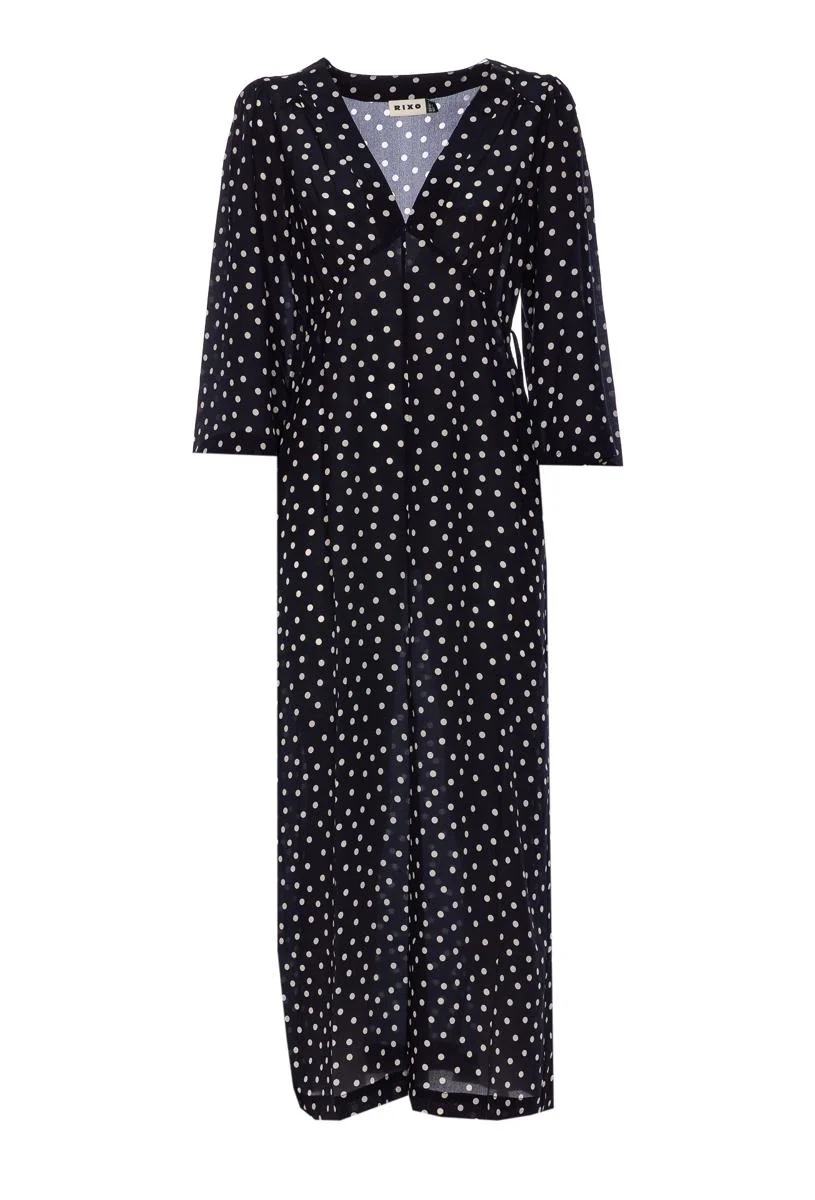 Rixo Blue Dahlia Dress, V-Neck, All Over Dots Print, 3/4 Sleeves, Laces Detail, US SIZE Gender: Women Material: 100% SILK Color: BLUE Made in: Imported Product ID: 0506606484 *Import tax/duty will be calculated at checkout (If applicable)
