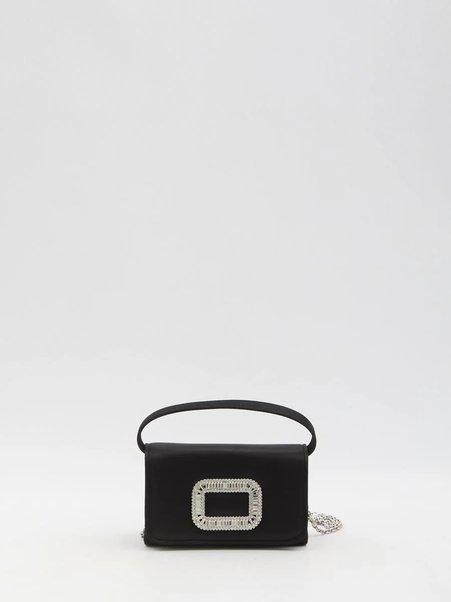 Micro bag in black satin. It features a fixed handle, a Pilgrim crystal buckle on the front, a magnetic button closure, a removable metal chain shoulder strap, one internal compartment, and an internal pocket. Dust bag included. Dimensions: 18x10,5x6cm Size nationality: UNI Gender: Women Material: 100% SATIN Color: Black Made in: IT Product ID: 5918942 RBWABDH000RS0 B999 *Import tax/duty will be calculated at checkout (If applicable)