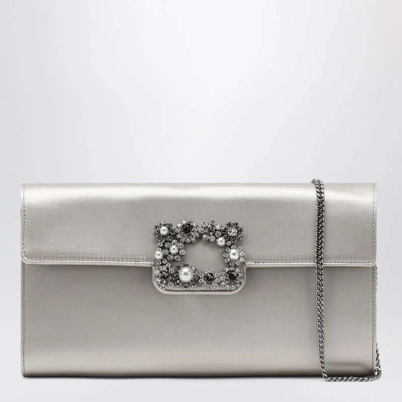 Pearl grey satin Roger Vivier clutch bag with jewelled buckle and chain strap. Gender: Women Material: 100% Satin Color: GREY Made in: Italy Product ID: RBWAMFD0206RS0/R_ROGVI-B007 *Import tax/duty will be calculated at checkout (If applicable)