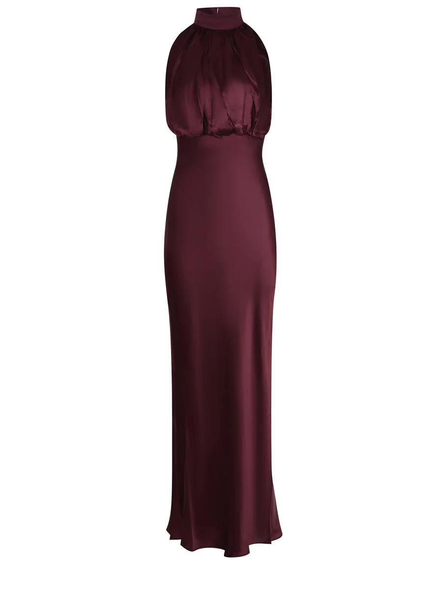 Rotate dress made of burgundy silk. Collar with closure at the back. Sleeveless. Draped top. Flared hem. Back zip closure. Gender: Women Material: SILK Color: PURPLE Made in: Imported Product ID: 1146542734BCR1908-2734 *Import tax/duty will be calculated at checkout (If applicable)