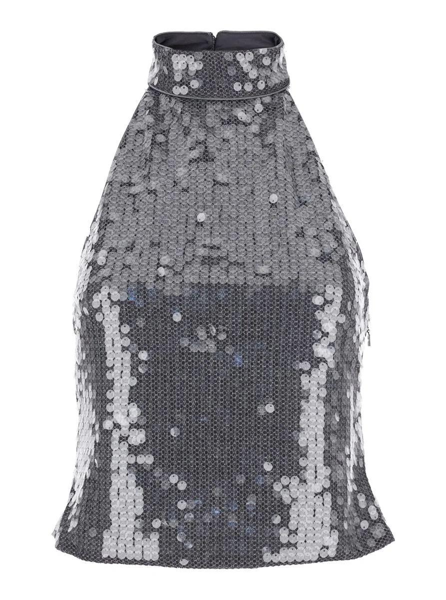 Top Grey American neckline Sleeveless Open back Sequins applied all over Tech fabric Regular fit Gender: Women Color: GREY Made in: Imported Product ID: 11434530593059 *Import tax/duty will be calculated at checkout (If applicable)