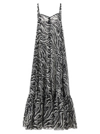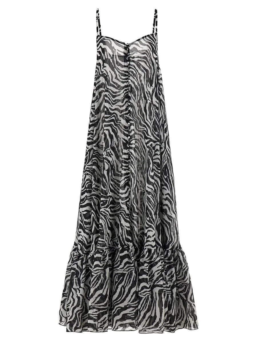 Rotate Birger Christensen x Reina Olga 'Light Flowy Maxi' dress in zebra print fabric with front button closure, thin adjustable straps, tiered hem. SUSTAINABLE: Product made from recycled polyester Gender: Women Material: 100% POLYESTER Color: Multicolor Made in: Imported Product ID: 11290729922992 *Import tax/duty will be calculated at checkout (If applicable)