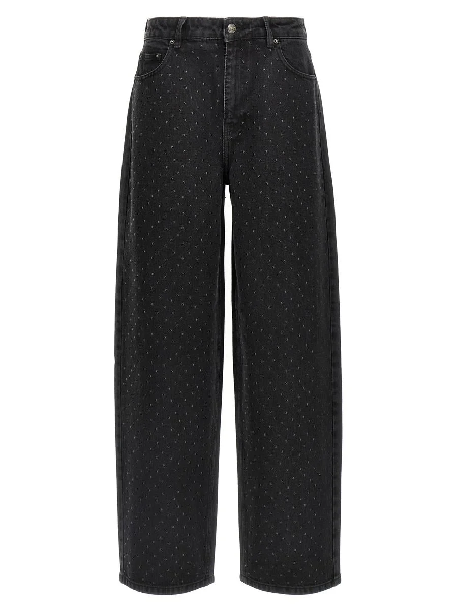 Garment-dyed cotton denim jeans with all-over tone-on-tone metal studs, zip and button closure, five pockets, straight leg, leather logo tag with metal lettering logo on the back. SUSTAINABLE: This product is made with recycled cotton Gender: Women Material: 100% RECYCLED COTTON Color: Black Made in: Imported Product ID: 11360629982998 *Import tax/duty will be calculated at checkout (If applicable)