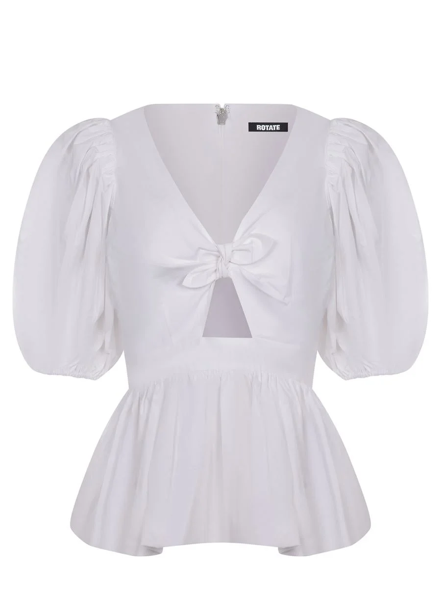 Top Rotate made of white cotton. V-neck. Elasticized balloon sleeves at the bottom. Bow detail on the chest. Cut-out at the front. Ruffle at the bottom. Zip at the back with a silver metal 'R' monogram. Gender: Women Material: COTTON Color: WHITE Made in: Imported Product ID: 114108400BCR1498-400 *Import tax/duty will be calculated at checkout (If applicable)