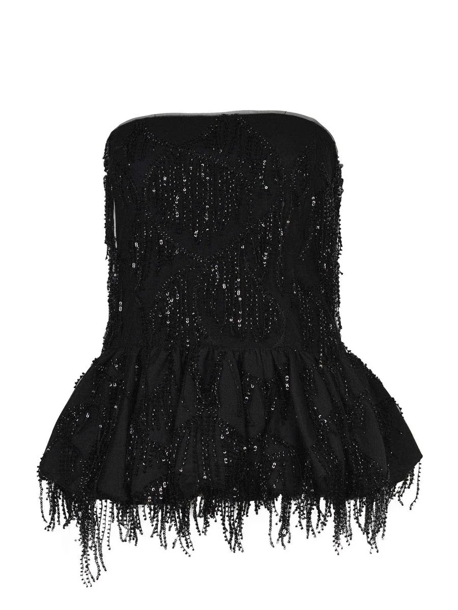 Top Rotate made of black polyester. Strap neckline. Sleeveless. All-over sequins and beaded fringes. Flared hem. Side zip closure. Lined. Gender: Women Material: POLYESTER Color: Black Made in: Imported Product ID: 114621100BCR1994-100 *Import tax/duty will be calculated at checkout (If applicable)