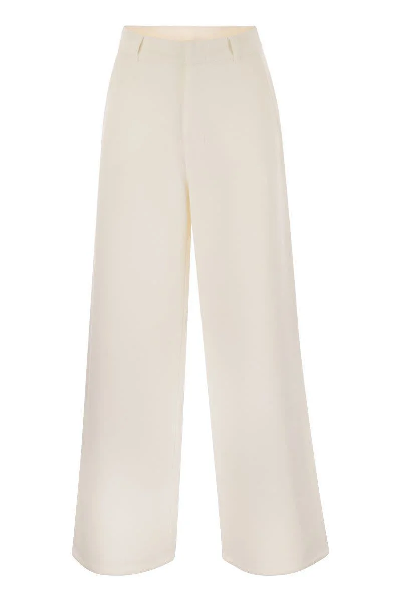 Long trousers in technical cotton jersey featuring a wide-leg silhouette. - Regular waist - High waistband, zip with flap and double hook fastening - Patch pockets on the back - Horizontal cut on the back of the knee DESIGNER ID: 2529786021600 001 Gender: Women Material: 78% COTTON, 22% POLYESTER Color: WHITE Made in: Italy Product ID: 2529786021600 001 *Import tax/duty will be calculated at checkout (If applicable)