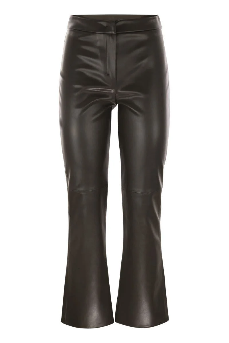 5-pocket trousers made of soft coated fabric, with leather-style cuts and seams. The ankle-length model features a fitted silhouette slightly flared at the bottom, with patch pockets on the back. - Covered zip and hook fastening - Ankle length - Five pockets DESIGNER ID: 2529786013600 004 Gender: Women Material: JERSEY FABRIC: 100% POLYESTER COATING POLYURETHANIC RESIN Color: Black Made in: Italy Product ID: 2529786013600 004 *Import tax/duty will be calculated at checkout (If applicable)