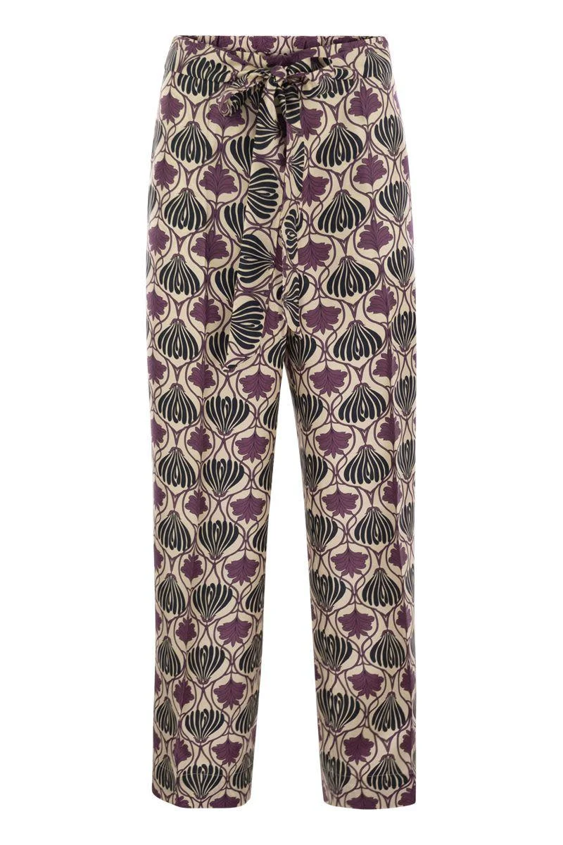 Pure silk twill trousers with all over printed pattern and cropped cut at the ankle. - Fluid line - Elasticated waistband at the back - High waistband, zip fastening with flap and hook fastening - Welt pockets on hips - Stretch pleat on leg - Matching belt to tie at the waist DESIGNER ID: 2529136022600 003 Gender: Women Material: 100% SILK Color: PURPLE Made in: Italy Product ID: 2529136022600 003 *Import tax/duty will be calculated at checkout (If applicable)