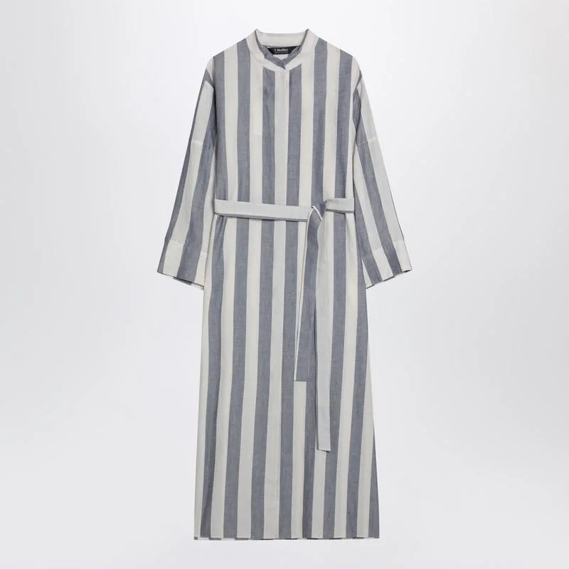 Midi shirt dress by 'S Max Mara in ramie and cotton in light blue and white stripes, featuring a hidden front button closure, long sleeves with buttoned cuffs, a tie belt at the waist, two side welt pockets, a mandarin collar, and a small logo patch on the back. Gender: Women Material: 70% Ramie - 30% Cotton Color: WHITE Made in: Romania Product ID: RIMACO/Q_MAXS-001 *Import tax/duty will be calculated at checkout (If applicable)