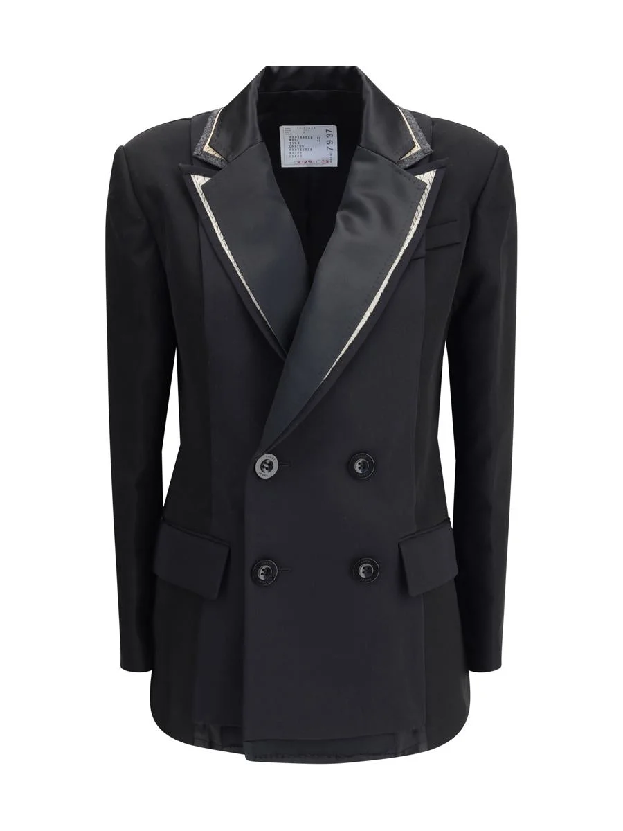 SACAI'S WOOL BLAZER IS A SOPHISTICATED PIECE THAT BLENDS CLASSIC ELEGANCE AND STYLISTIC EXPERIMENTATION. MADE FROM FINE WOOL, IT FEATURES A DOUBLE-BREASTED CUT WITH FRONT BUTTONS THAT EMPHASIZE ITS TAILORED STRUCTURE. ON THE FRONT, TWO WELT POCKETS WITH FLAPS ADD FUNCTIONALITY AND SYMMETRY TO THE DESIGN. PARTICULARLY DISTINCTIVE IS THE DOUBLE LAYER OF PEAKED LAPELS, AN ICONIC ELEMENT THAT GIVES THE BLAZER A STRONG VISUAL IDENTITY AND CONTEMPORARY APPEAL. A PERFECT GARMENT FOR THOSE SEEKING SOPHISTICATION WITH AN INNOVATIVE TWIST. NUMERIC Gender: Women Material: POLYESTER | WOOL Color: Black Made in: Imported Product ID: 2507937_001 *Import tax/duty will be calculated at checkout (If applicable)