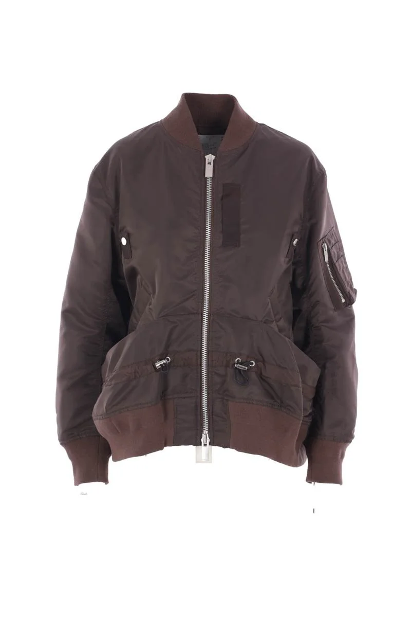 Sacai bomber jacket made of brown nylon twill. Featuring a bomber collar, front double-slider zip closure, multiple pockets, long sleeves, ribbed knit trims, and a deconstructed hem with drawstring. Lined interior. Gender: Women Material: NYLON 100% Color: BROWN Made in: Imported Product ID: 2507992601 *Import tax/duty will be calculated at checkout (If applicable)