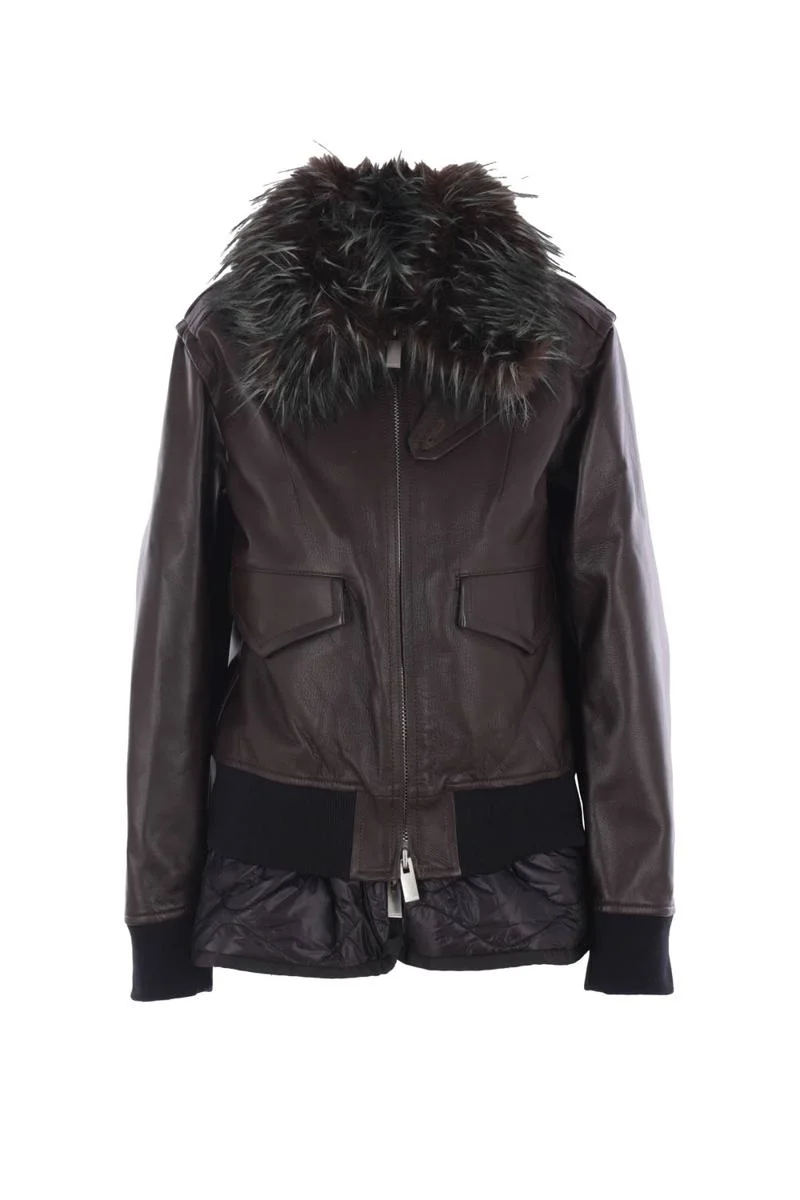 Sacai bomber jacket crafted from dark brown leather. Featuring a pointed collar with removable faux fur trim, front closure with two-way zip, flap pockets, long sleeves, ribbed knit trims, and a lined interior. The design is completed by a removable black quilted nylon vest with V-neckline, front pockets, and flared hem. Gender: Women Material: COWHIDE Color: BROWN Made in: Imported Product ID: 2508238601 *Import tax/duty will be calculated at checkout (If applicable)