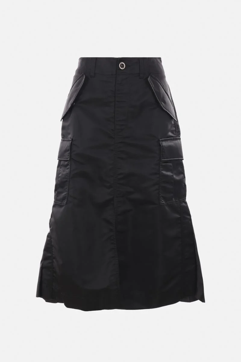 Sacai midi skirt crafted in black nylon twill with back pleated panel. Featuring elasticated waistband, button / zip closure, belt loops, multiple pockets, front slit and lined interior. Gender: Women Material: NYLON 100% Color: Black Made in: Imported Product ID: SCW205001 *Import tax/duty will be calculated at checkout (If applicable)