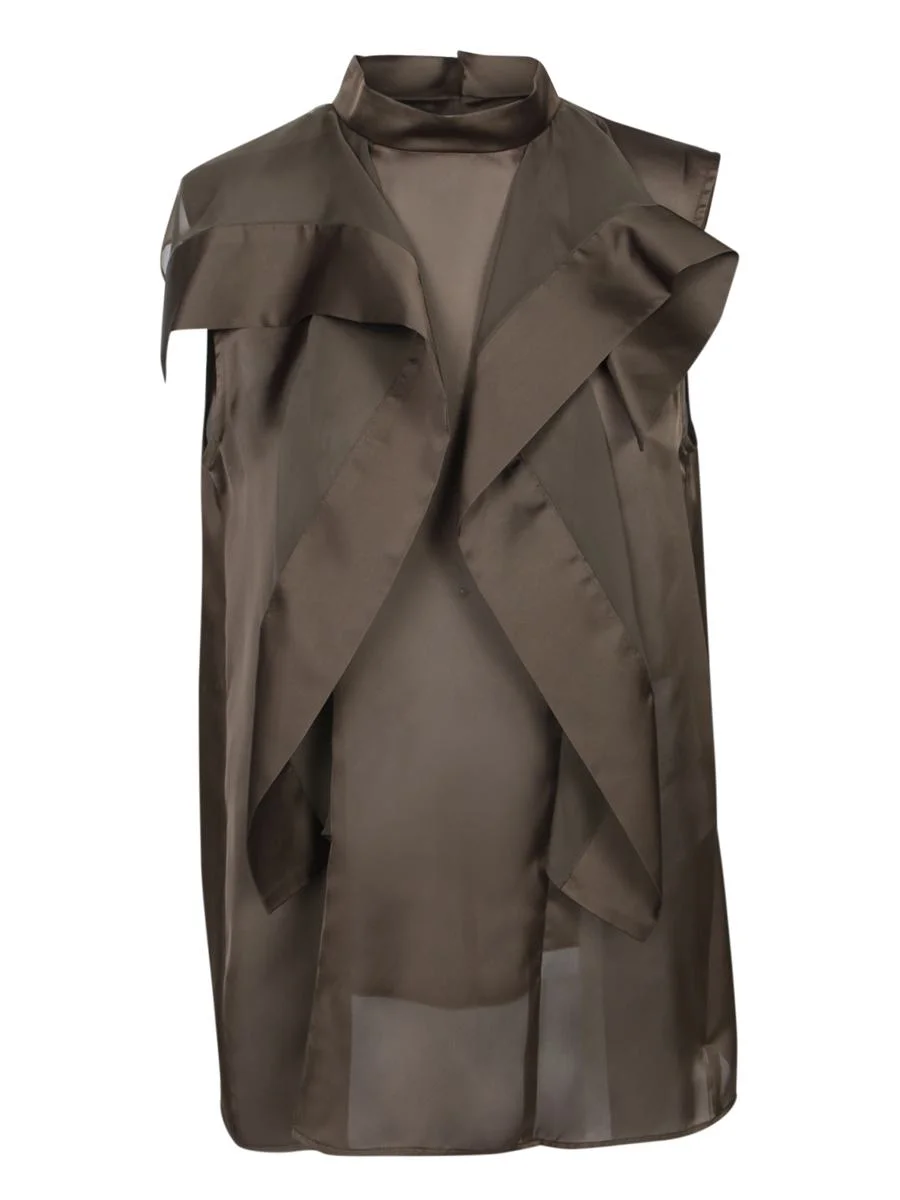 Sleeveless tank top. Crafted from satin chiffon. Khaki color with asymmetrical layered details. This SACAI tank top enhances a bold silhouette with its asymmetrical layered design and satin finish, offering a perfect balance between modern elegance and striking style. Gender: Women Material: 100% POLYESTER Color: GREEN Made in: Imported Product ID: 2507924 501 *Import tax/duty will be calculated at checkout (If applicable)