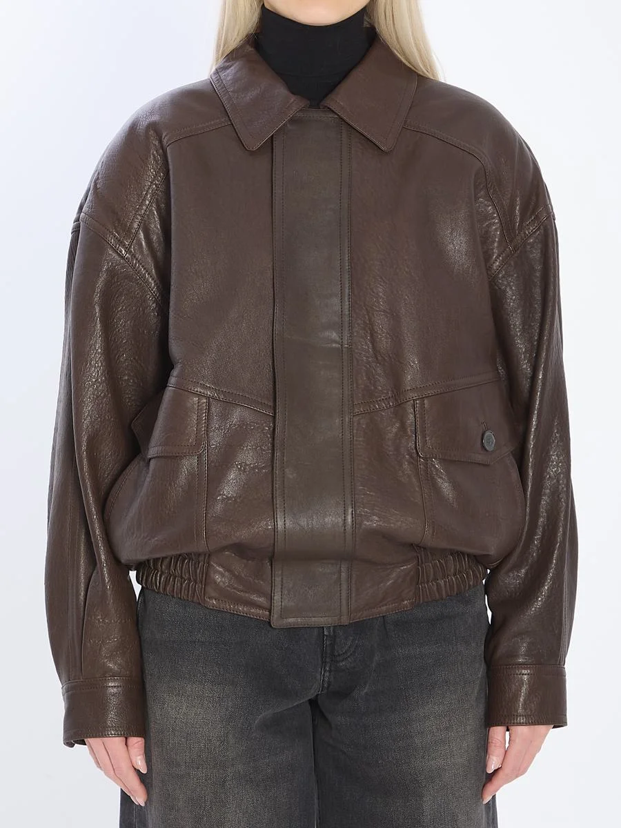Jacket in Braun Sepia brown lambskin leather. Features a pointed collar, front zip closure with wind flap and buttons, two front welt pockets, two flap pockets with buttons, buttoned cuffs, padded shoulders, and gathered waist. Lined in cotton and viscose. Balloon silhouette with a slightly oversized fit. The model is 178 cm tall and wears size FR 38. Size nationality: FR Gender: Women Material: GENUINE LEATHER: 100% LAMBSKIN; LINING: 53% COTTON, 47% VISCOSE; POCKET LINING: 100% COTTON Color: BROWN Made in: Italy Product ID: 7974502 842948 YCNF2 2509 *Import tax/duty will be calculated at checkout (If applicable)