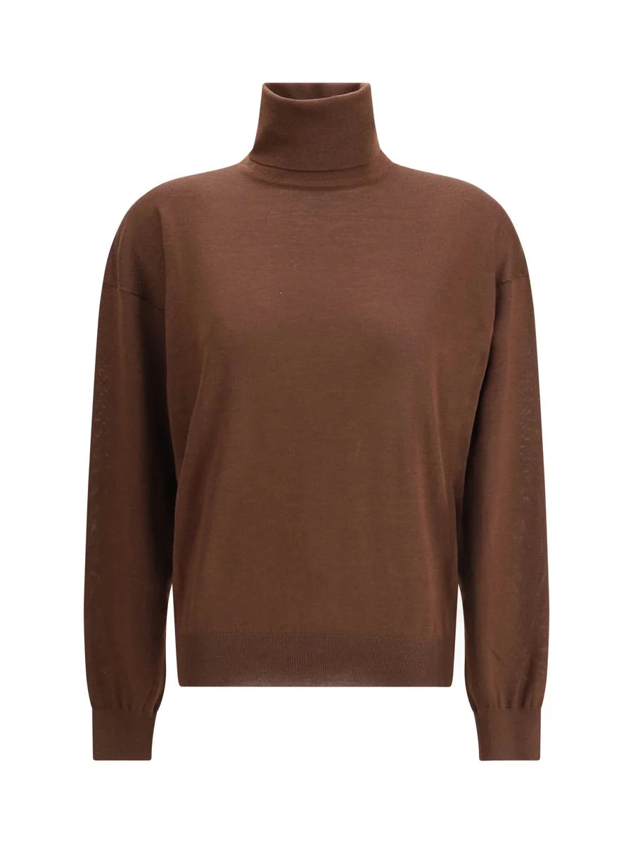SAINT LAURENT'S CASHMERE, WOOL AND SILK TURTLENECK PULLOVER IS A SNUG AND REFINED PIECE THAT COMBINES COMFORT AND UNDERSTATED LUXURY. FEATURING A LOOSE FIT WITH DROPPED SHOULDERS, IT IS FINISHED WITH RIBBED DETAILS THAT GIVE STRUCTURE AND HARMONY TO THE SOFT LINES. MADE FROM CERTIFIED CASHMERE AND WOOL, WITH ADDED SILK FOR A SILKY TOUCH, IT REPRESENTS THE PERFECT BALANCE BETWEEN TIMELESS ELEGANCE AND SOPHISTICATED ESSENTIALITY. STANDARD Gender: Women Material: KASHMIR/CAPRA HIRCUS | WOOL | SILK Color: BROWN Made in: Italy Product ID: 850335YAPK2_2036 *Import tax/duty will be calculated at checkout (If applicable)