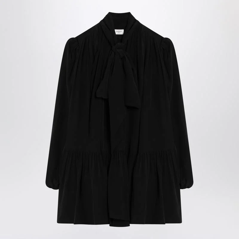 Wide Saint Laurent dress in black silk, characterized by long puff sleeves, ruffled skirt, button closure at the front, two side pockets, and lavalliere collar. Gender: Women Material: 100% Silk Color: Black Made in: Imported Product ID: 832871Y7K76/Q_YSL-1000 *Import tax/duty will be calculated at checkout (If applicable)