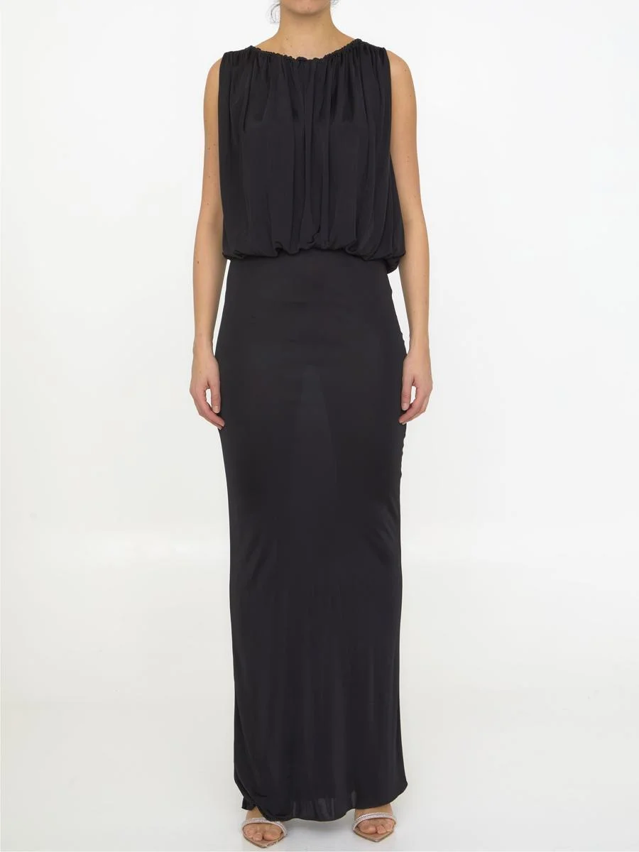 Sleeveless long dress in black shiny viscose jersey. It features round neckline on the front, deep V-neckline on the back, pleated details and tight skirt. The model is 177cm tall and wears size 36. Size nationality: FR Gender: Women Material: 100% VISCOSE Color: BLACK Made in: IT Product ID: 603908 723241Y7F98 1000 *Import tax/duty will be calculated at checkout (If applicable)