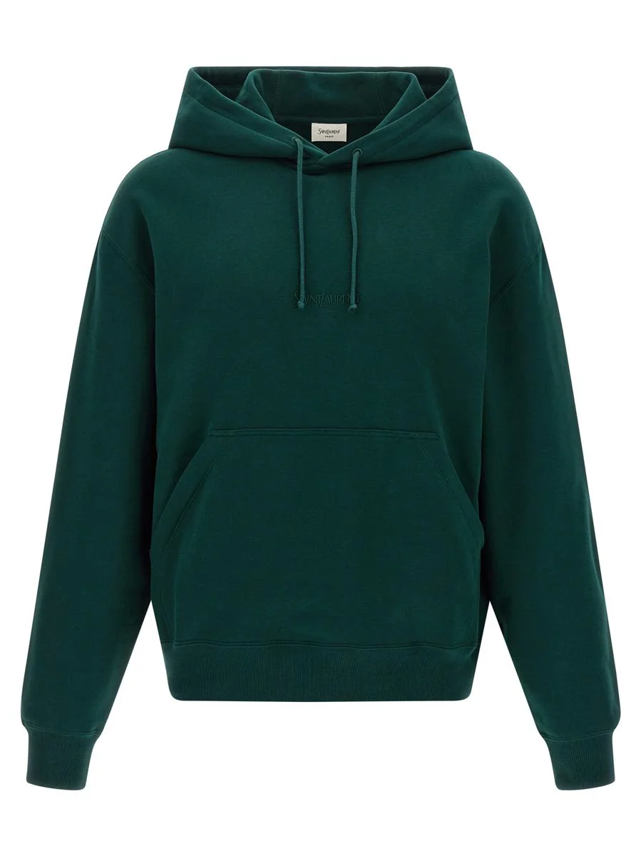 Fleece cotton hoodie with tonal 'Saint Laurent' embroidery on the front, kangaroo pocket, long cuffed sleeves and dropped shoulders Gender: Men Material: 100% COTTON Color: GREEN Made in: Imported Product ID: 818538Y36SW3041 *Import tax/duty will be calculated at checkout (If applicable)