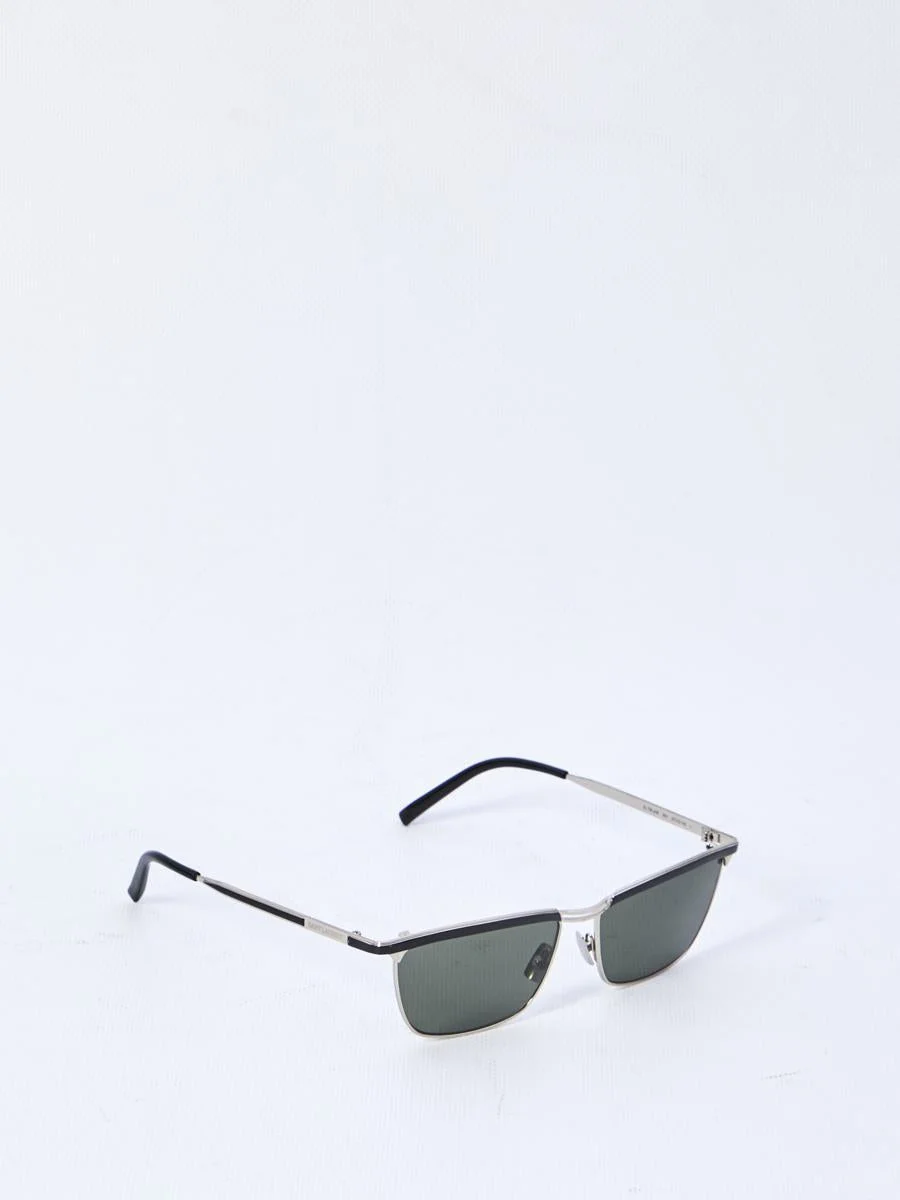 Trapezoidal sunglasses with silver tone metal frame and nylon lenses. Feature a double bridge, top bar with black insert, and Saint Laurent signature engraved on the temples. The frame is compatible with prescription lenses. Lens width: 5.7 cm Bridge: 1.5 cm Temple length: 14 cm Size nationality: UNI Gender: Men Material: 100% METAL Color: SILVER Made in: Imported Product ID: 9228826 843043 Y9969 8100 *Import tax/duty will be calculated at checkout (If applicable) WARNING CALIFORNIA PROPOSITION 65 This product can expose you to chemicals including Nickel (Metallic), which is known to the State of California to cause cancer. For more information go to https://p65warnings.ca.gov California Health & Safety Code Section 25249.6 *Shipping eyewear products to US only For US customers, eyewear products are categorized as Class 1 medical devices by the 21 Code of Federal Regulations (CFR) - Food and Drug Administration (FDA). Baltini ships eyewear orders on a Delivery Duties Paid (DDP) basis. This means that all applicable duties are included in the final price calculated at the checkout and there are no additional costs due upon delivery.