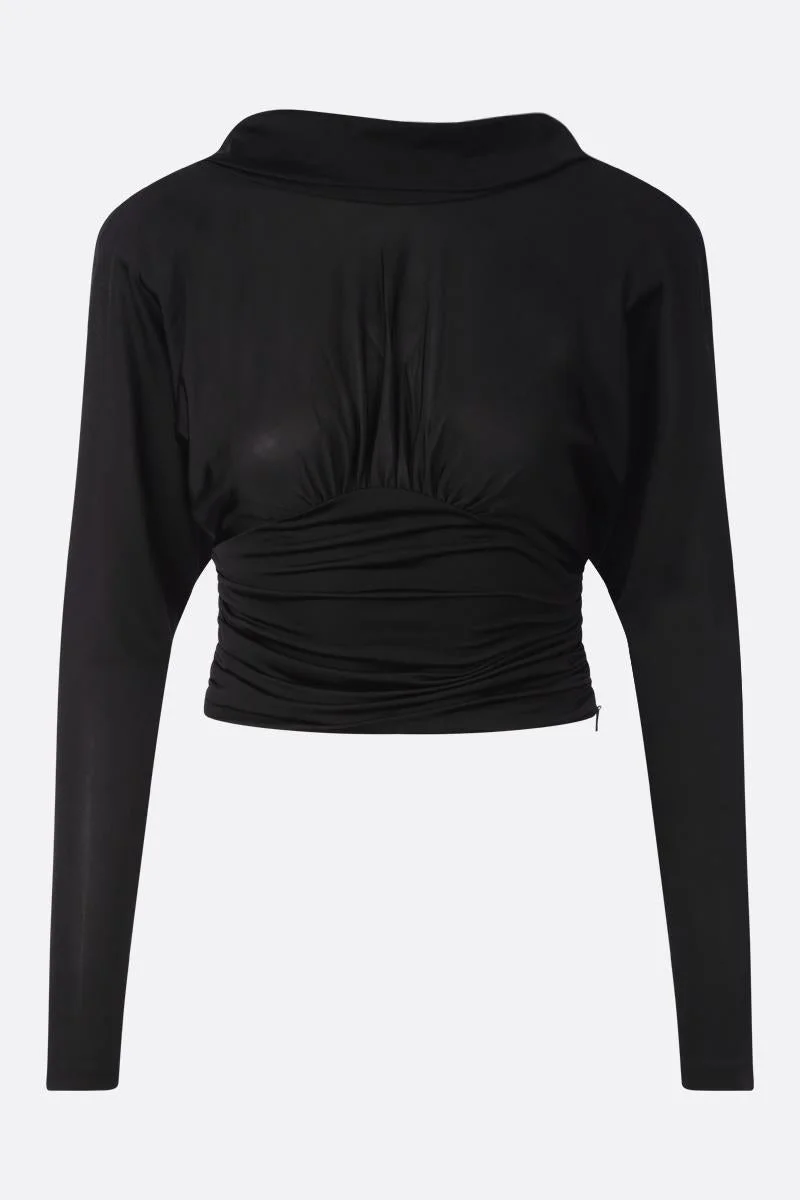Saint Laurent's cropped top crafted in black stretch jersey. It features draped collar, side invisible zip fastening, long sleeves, padded shoulders, open back and gathered waist. Gender: Women Material: T VISCOSE 100% Color: Black Made in: FR Product ID: 695231Y36UU1000 *Import tax/duty will be calculated at checkout (If applicable)