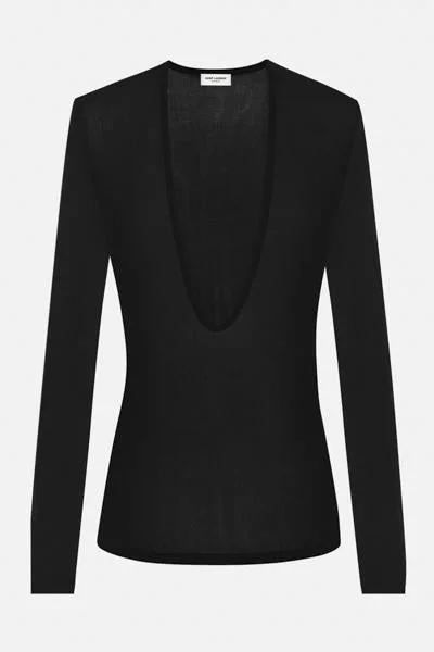 Saint Laurent's top crafted in black viscose knit. Featuring deep U-neckline, long sleeves and straight hem. Gender: Women Material: T VISCOSE 100%;R VISCOSE 91%;R POLYAMIDE 7%;R ELASTAN 2% Color: Black Made in: IT Product ID: 783451Y75YK1000 *Import tax/duty will be calculated at checkout (If applicable)