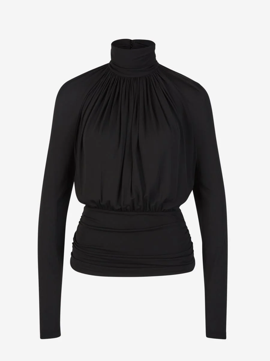 Saint Laurent blouse Gathering along the neck Cinched waist High neck Long sleeve Back zip fastening Plain back Made in Italia 100% Viscose Gender: Women Material: 100% VISCOSE Color: Black Made in: Italy Product ID: 750261 Y5F63_1000NOIR *Import tax/duty will be calculated at checkout (If applicable)