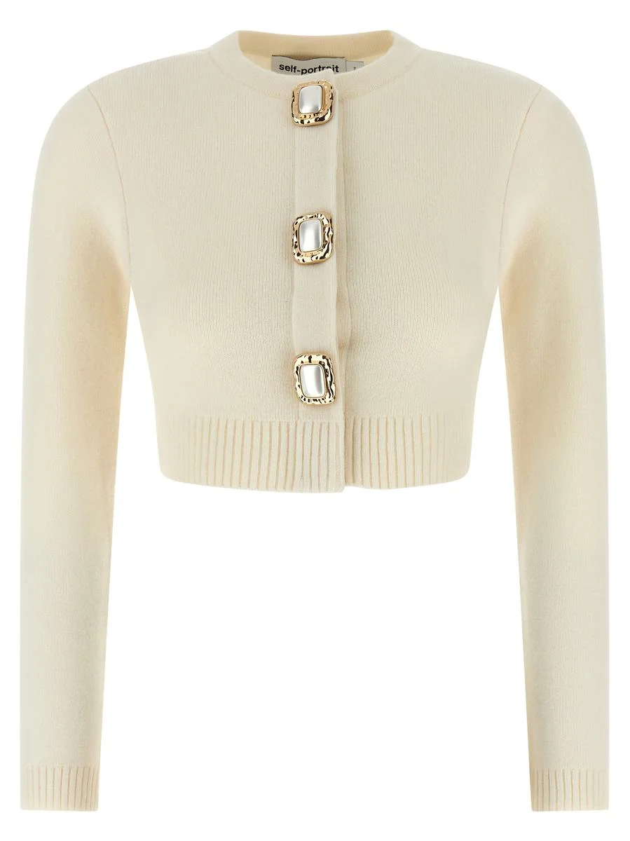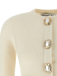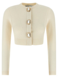 'Cream Wool' wool cardigan, crop model, front hidden snap button closure with overlapping jewel buttons, crew neck, long sleeves Gender: Women Material: 93% WOOL 6% POLYAMIDE 1% ELASTANE Color: WHITE Made in: Imported Product ID: AW25018CCCREAM *Import tax/duty will be calculated at checkout (If applicable)