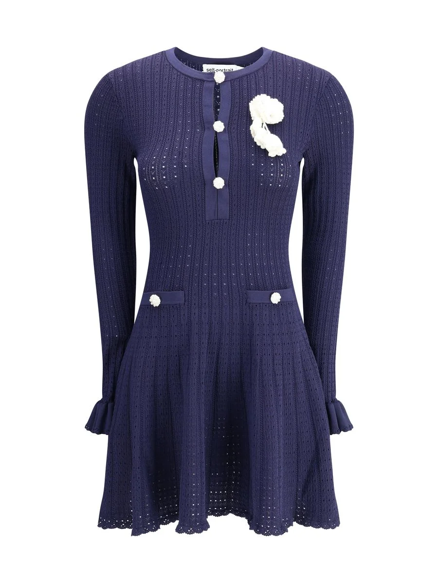 Navy Pointelle Knit Crochet Flower Mini Dress