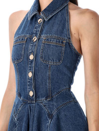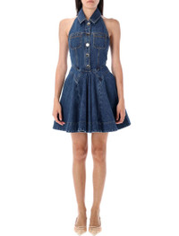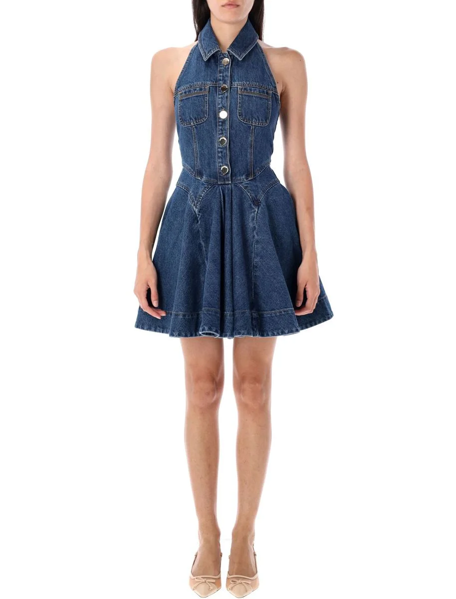 Denim sleeveless flared mini dress by Self-Portrait. Featuring: Halterneck Spread collar Sleeveless Gold-tone button embellishment Chest patch pocket Back zip closure Flirty flared hem Model is 1,70 m and wears size 6 Gender: Women Material: 100% COTTON Color: BLUE Made in: Imported Product ID: 25APF25830SBL#BLUE *Import tax/duty will be calculated at checkout (If applicable)