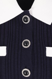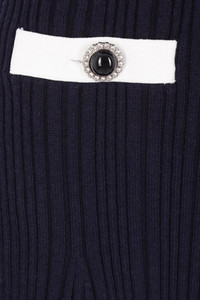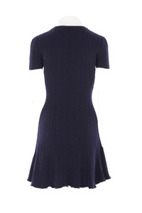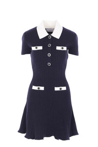 Self-Portrait mini dress crafted from ribbed blue knit with contrasting details. Featuring a polo collar, front closure with jeweled buttons, front pockets, short sleeves, and a flared skirt. Gender: Women Material: MAIN: 42%POLYAMIDE 22%VIS 17%POLYESTER 15%WOOL 4%WP TRIM: 82%VIS 18%POLYESTER Color: BLUE Made in: Imported Product ID: AW25014SN *Import tax/duty will be calculated at checkout (If applicable)
