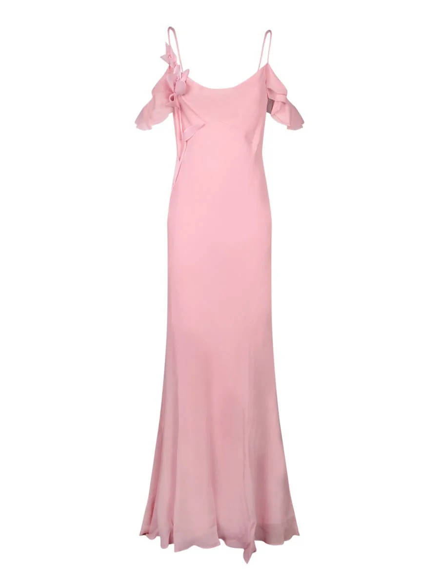 Long pink georgette dress with floral details. Adjustable thin straps and refined ruffles on the shoulders. This elegant Self Portrait dress gently cascades down the figure, embellished with delicate ruffles that add a romantic touch. Its light and flowing fabric makes it perfect for special occasions. Gender: Women Material: 100% VISCOSE Color: PINK Made in: Imported Product ID: SS25254XP PINK *Import tax/duty will be calculated at checkout (If applicable)