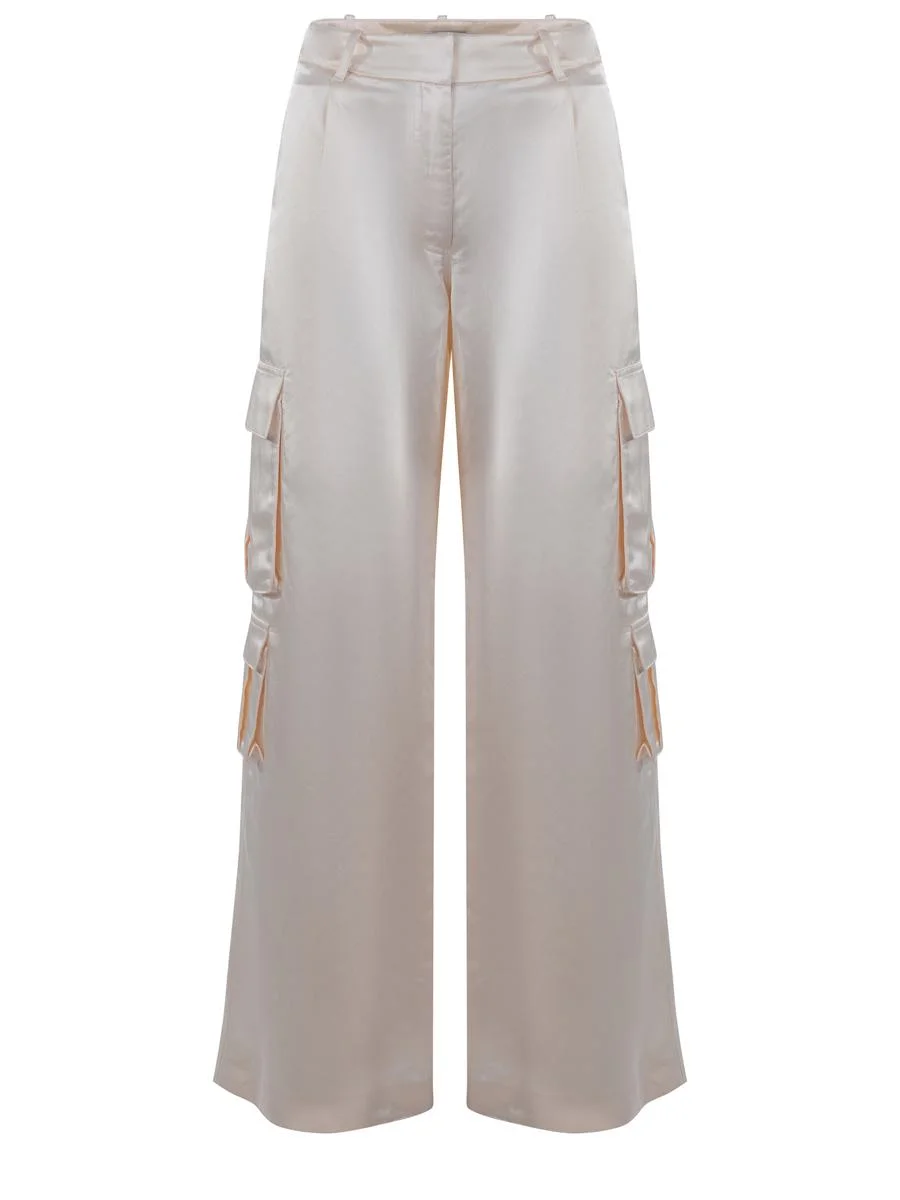 Cargo pants Self-Portrait made of Cream satin. Belt loops. Side pockets. Zip and flap closure. Cargo pockets with flap, side. Wide leg. Flap pockets on the back. Gender: Women Material: MISTO VISCOSA Color: Beige Made in: IMPORTED Product ID: 039PCREAM *Import tax/duty will be calculated at checkout (If applicable)