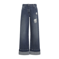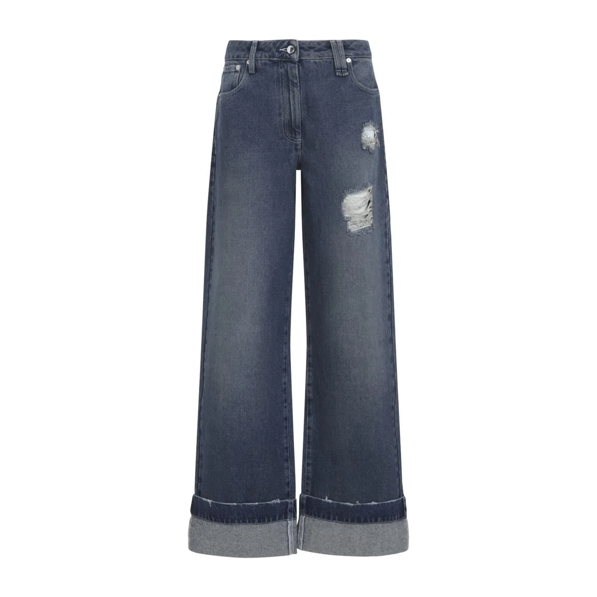 Simone Rocha Distressed Straight Leg Blue Cotton Jeans. Crafted from bleached blue cotton denim, distressed details, mid waist, 5-pocket construction, front button and fly-zip fastening, belt loops, leather label with crystal embellishments on the back waistband, turn-up edges, wide leg. Gender: Women Material: 100%COTTON Color: BLUE Made in: Portugal Product ID: 4164.1231D_ *Import tax/duty will be calculated at checkout (If applicable)
