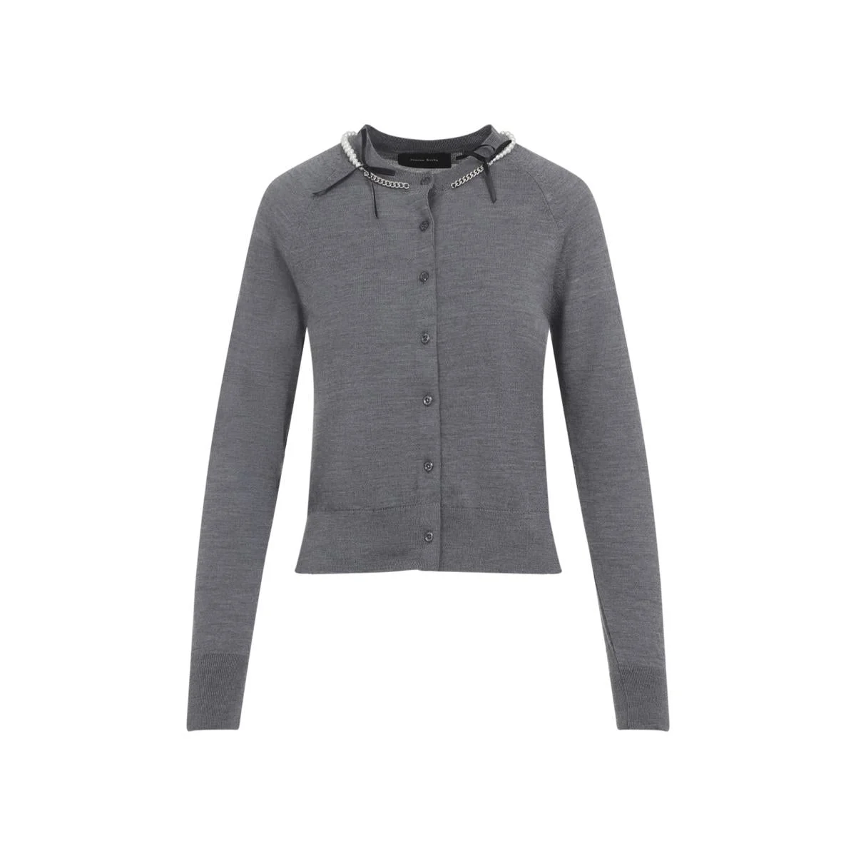 Simone Rocha Classic Grey Merino Wool and Silk Cardigan. Crafted from grey merino wool and silk, round neckline, black bows, chain and pearls embellishment, front button fastening, long raglan sleeves, fine ribbed edges. Gender: Women Material: 75%MERINO WOOL 25%SILK Color: GREY Made in: Portugal Product ID: KMK13B.0647_ *Import tax/duty will be calculated at checkout (If applicable)
