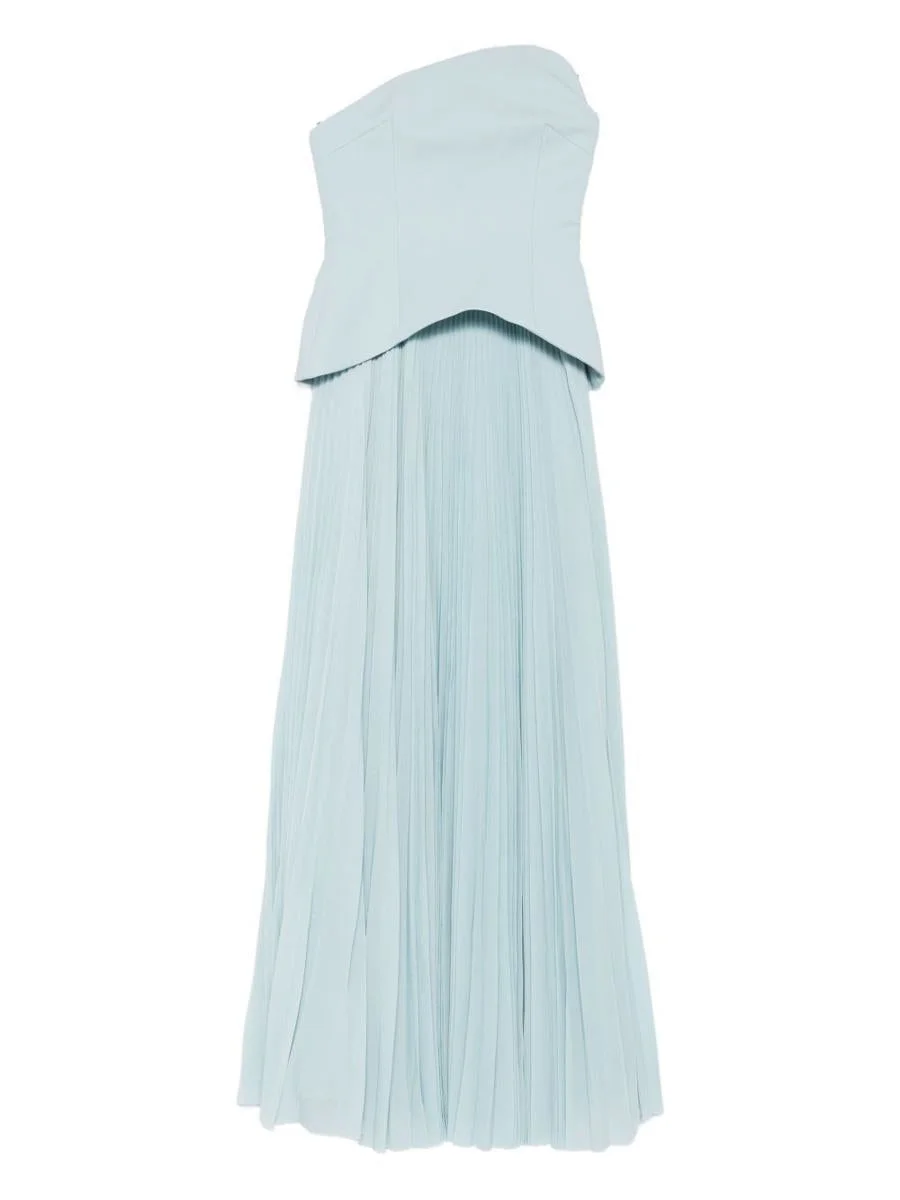 light blue pleated skirt strapless bodice fitted top asymmetric neckline A-line skirt This piece fits true to size. We recommend you get your regular size Model is 1,75m / 5ft 8in wearing size 8 (UK) Gender: Women Material: OUTER: POLYESTER 100% Color: CLEAR BLUE Made in: Imported Product ID: OS44017ARCTICBLUE *Import tax/duty will be calculated at checkout (If applicable)