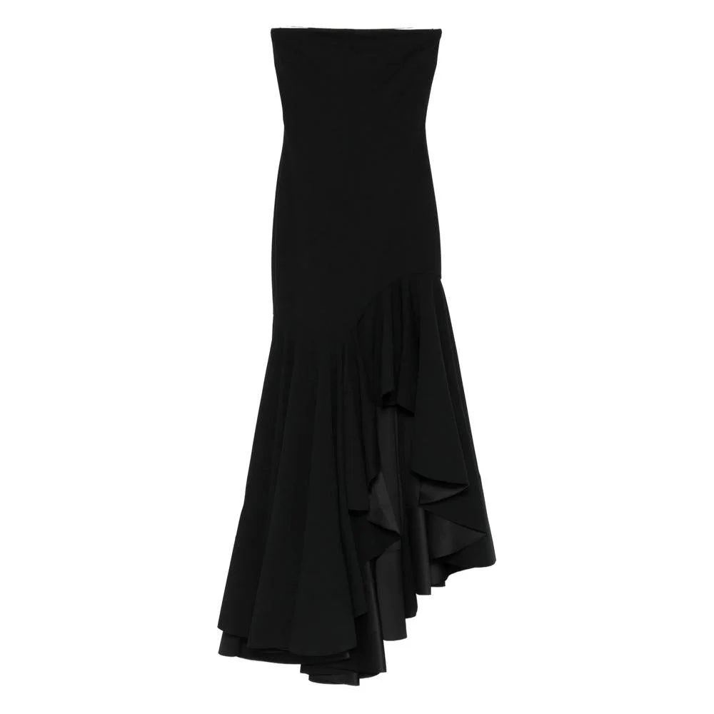Black strapless neckline asymmetrical ruffled hem fitted bodice Gender: Women Material: POLYESTER: 95.0%, ELASTANE: 5.0% Color: Black Made in: Imported Product ID: OS45031 BLACK *Import tax/duty will be calculated at checkout (If applicable)