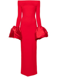 red crepe texture column silhouette off-shoulder concealed rear hook and zip fastening long sleeves oversized puff cuffs rear slit straight hem maxi This piece fits true to size. We recommend you get your regular size Model is 1,75m / 5ft 8in wearing size 8 (UK) Gender: Women Material: POLYESTER 95% ELASTANE 5% Color: RED Made in: Imported Product ID: OS40014RED *Import tax/duty will be calculated at checkout (If applicable)
