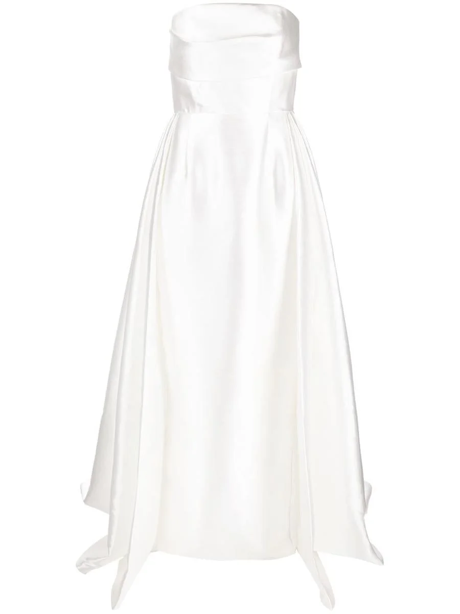 cream white bandeau style metallic sheen strapless inverted pleat flared skirt rear zip fastening high-low hem floor-length This piece fits true to size. We recommend you get your regular size Model is 1,75m / 5ft 8in wearing size 8 (UK) Gender: Women Color: WHITE Made in: Imported Product ID: OS34030CREAM *Import tax/duty will be calculated at checkout (If applicable)